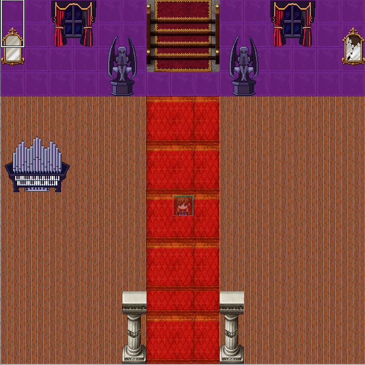 Here is my early art build for my game. Here we have the foyer, hallway, storage room, and upstairs landing. Based on feedback I received, I will have a small number of rooms that interconnect to make sure I'm putting the most details in the different areas of the map. I am still passionate and eager about the direction I am taking for JIBUN. I did take a slight shift in engines, though, before I was using RPG Maker XP, but I have switched to MZ due to the modernity of the engine, and more features are available to me. I think the use of the reds and purples really gives it a supernatural and gothic vibe overall. I haven't run into many issues yet involving art, but I do expect some when I actually start implementing the more advanced code as I come closer to the final build of the game.